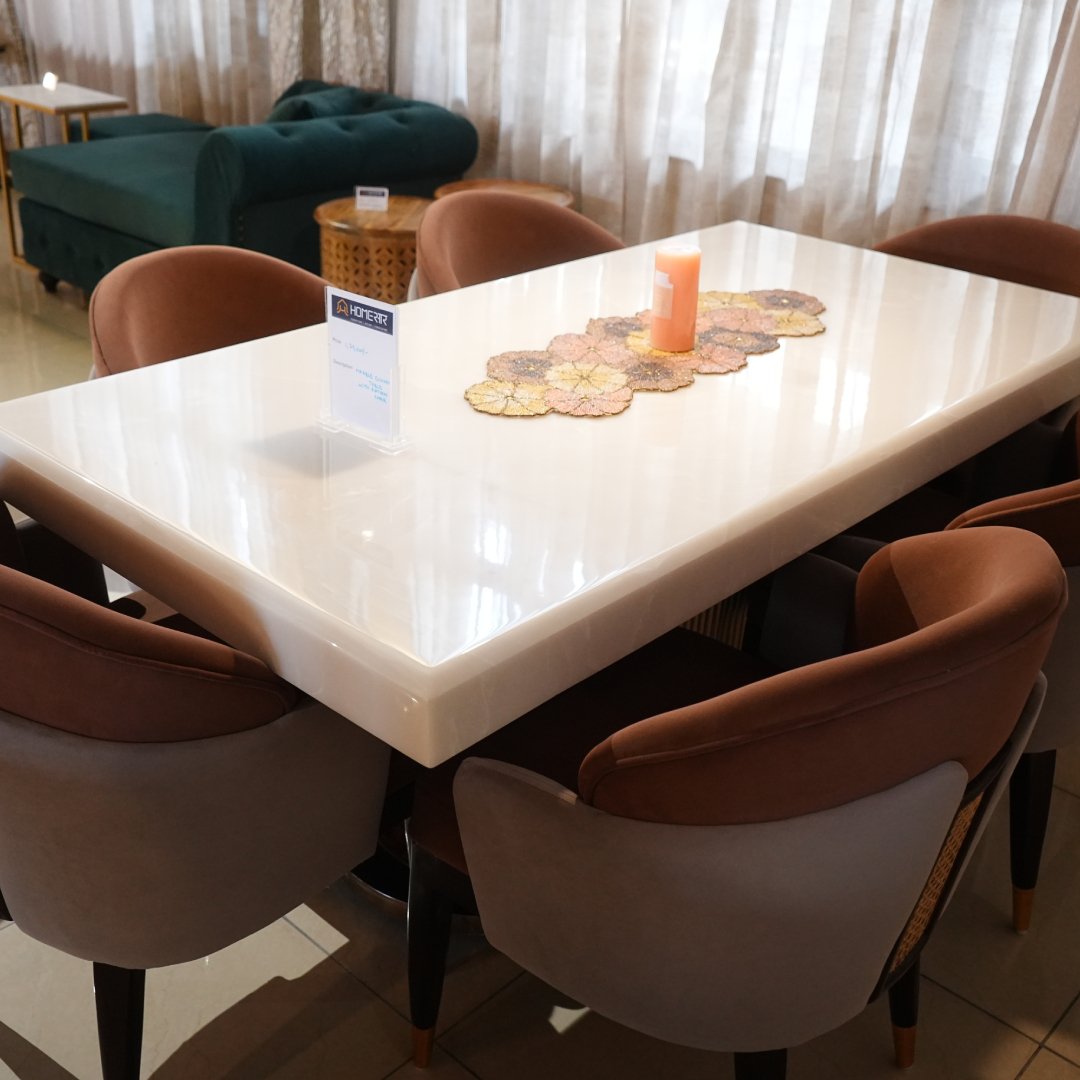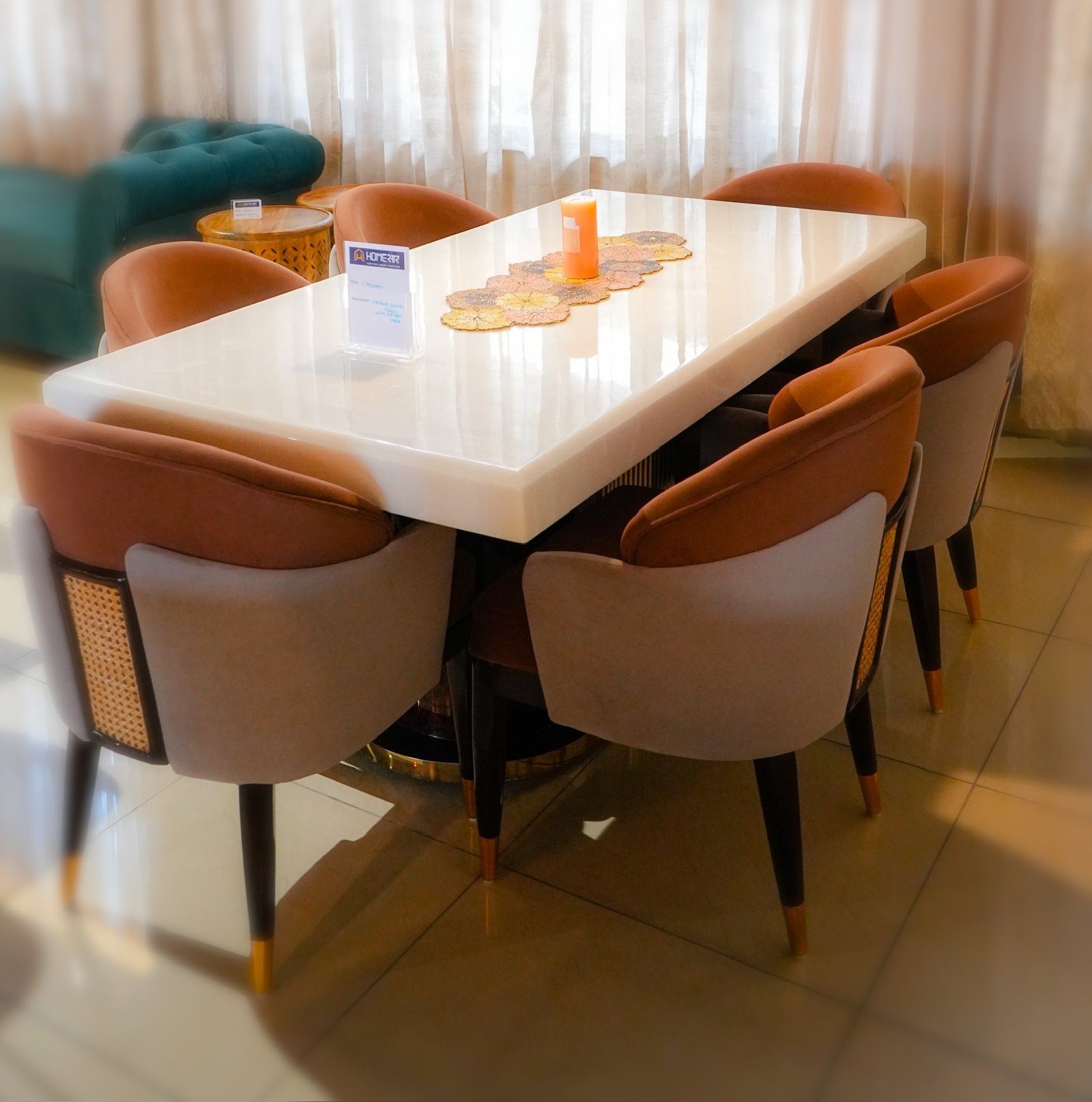 Elevate your dining experience with our exquisite marble dining table accompanied by luxurious captain chairs.